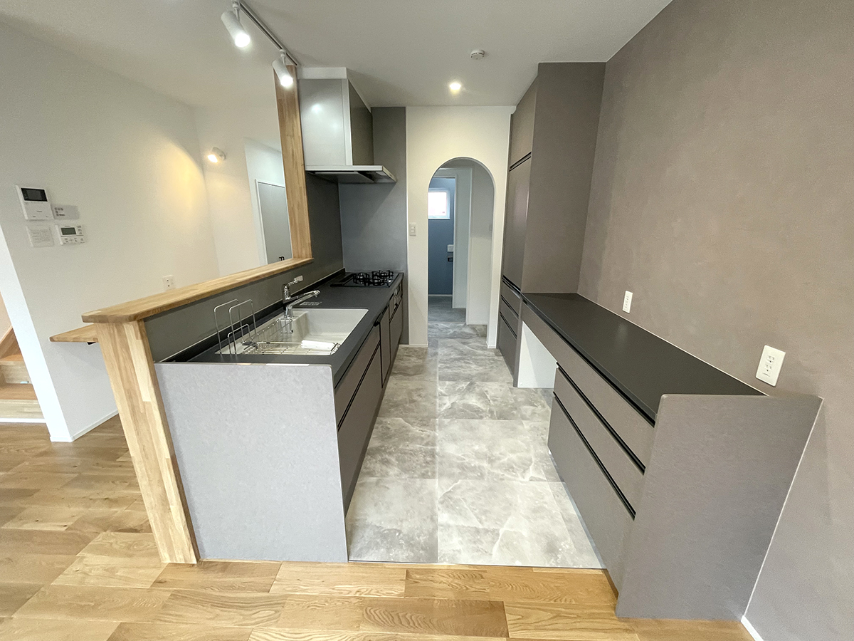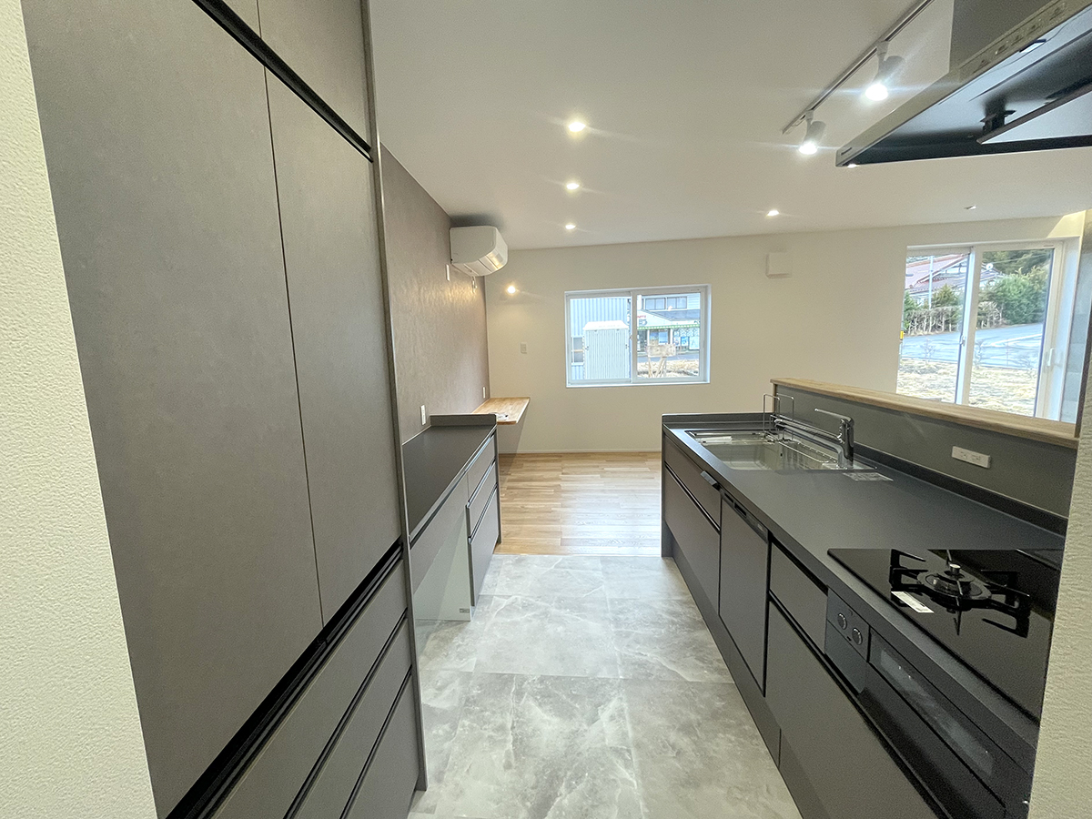 暮らしの中心となるLDKは、キッチンとダイニングを横並びに。配膳や片付けがスムーズな動線は、忙しい毎日に心のゆとりを生みます。リビング隣の4.5帖の和室は、将来1階だけで生活を完結できる「終の棲家」としての機能も備えました。